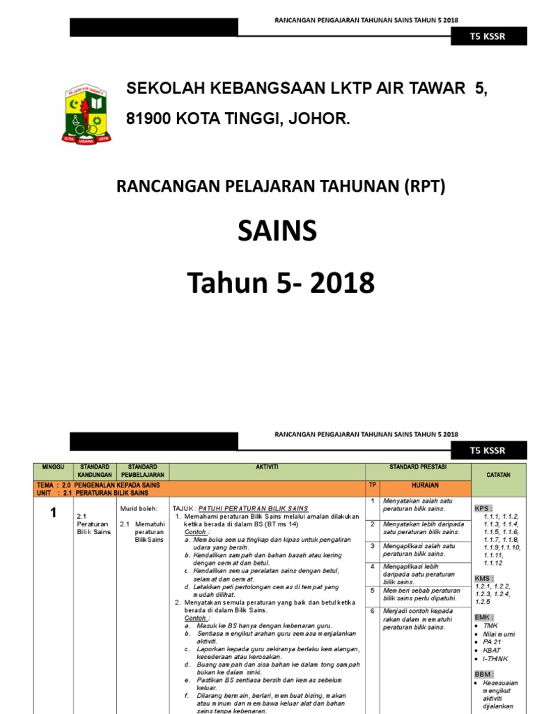 Selain daripada rpt, anda juga boleh download dskp bagi sains tingkatan 1 untuk kssm dan juga pemetaan modul hebat sains bagi tingkatan 1, 2 dan 3. Berikut merupakan rpt bagi mata pelajaran sains tahun 5 2017. Berikut adalah senarai rpt bagi pelbagai mata pelajaran untuk tahun 5. Sains kelas bercantum januari 2017.pdf. Documents similar to rpt kssr sains tahun 5.